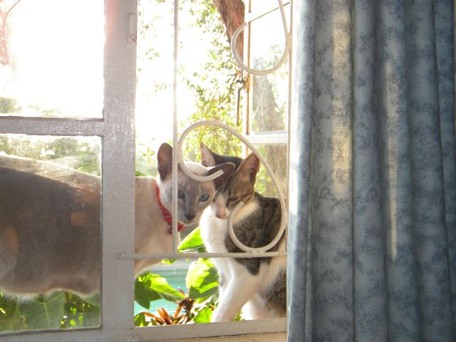 Mr Tigger is coming to say good morning. Recently he is coming down to my bedroom to meu a good morning and gets a cuddle every morning before breakfast. As soon as he hears Dave call and put the feeding dishes down he is off as a flash to eat. This morning he was followed by Yoda. It is a hot tropical rainy day and Muis was scouting all the windows to find an opening so that he can stay in all day.